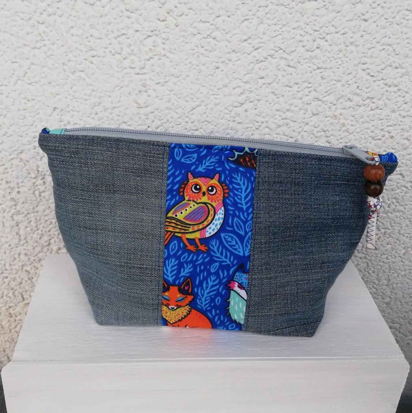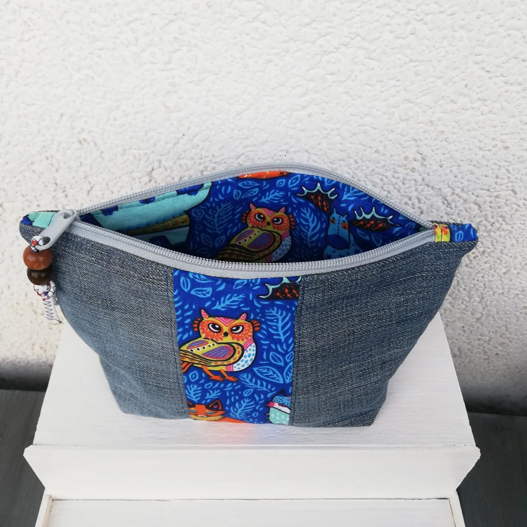 Das Kosmetiktäschchen Eule-blau ist aus Baumwollstoffen /Jeans genäht. Der Innenstoff ist ebenfalls aus Baumwolle aus dem gleichen Stoff wie der Streifen auf der Außenseite.