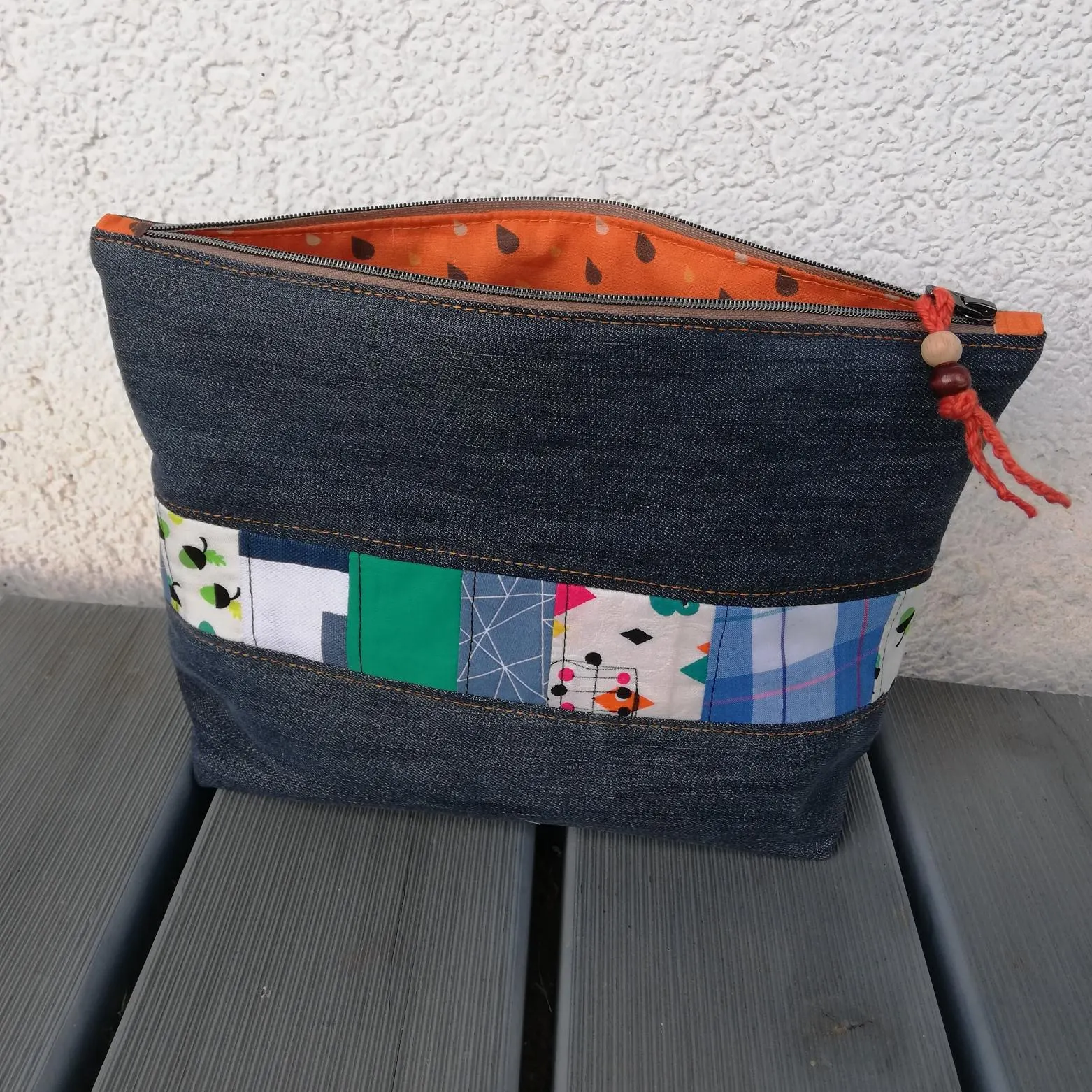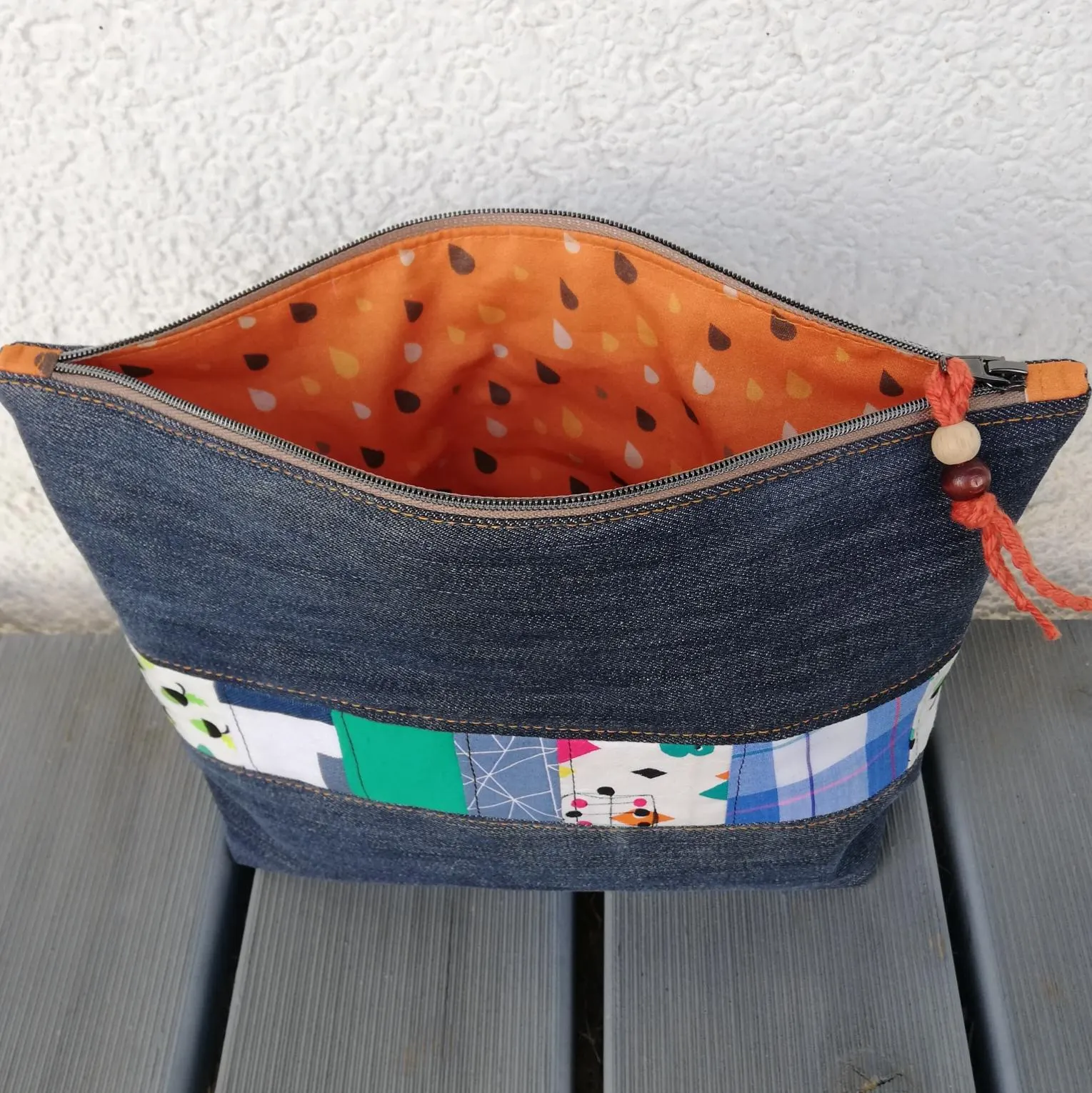 Das Kosmetiktäschchen Jeans-Orange ist aus Baumwollstoffen /Jeans genäht. Der Innenstoff ist ebenfalls aus einem Baumwollestoff in orange mit Tropfen genäht.
