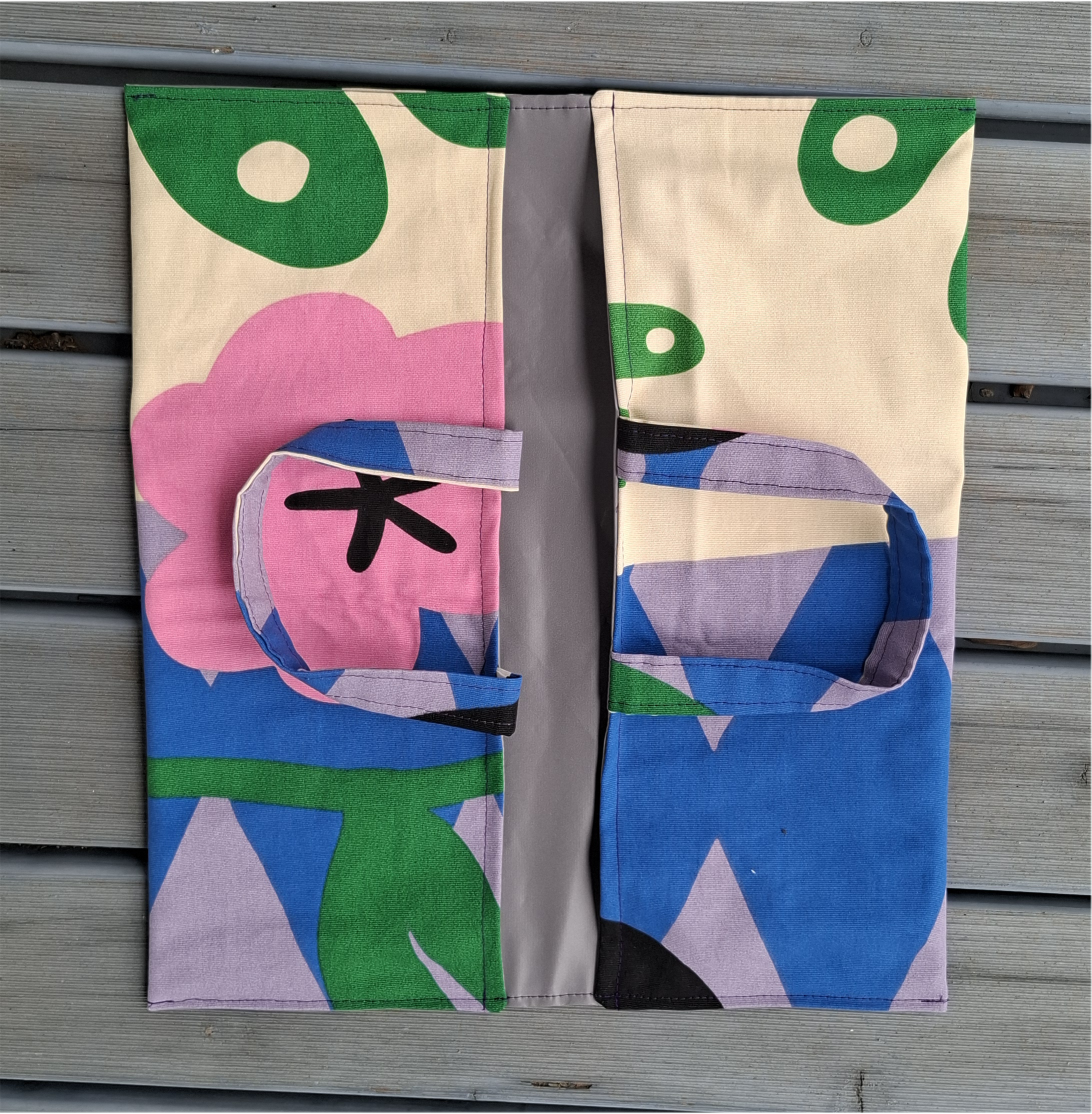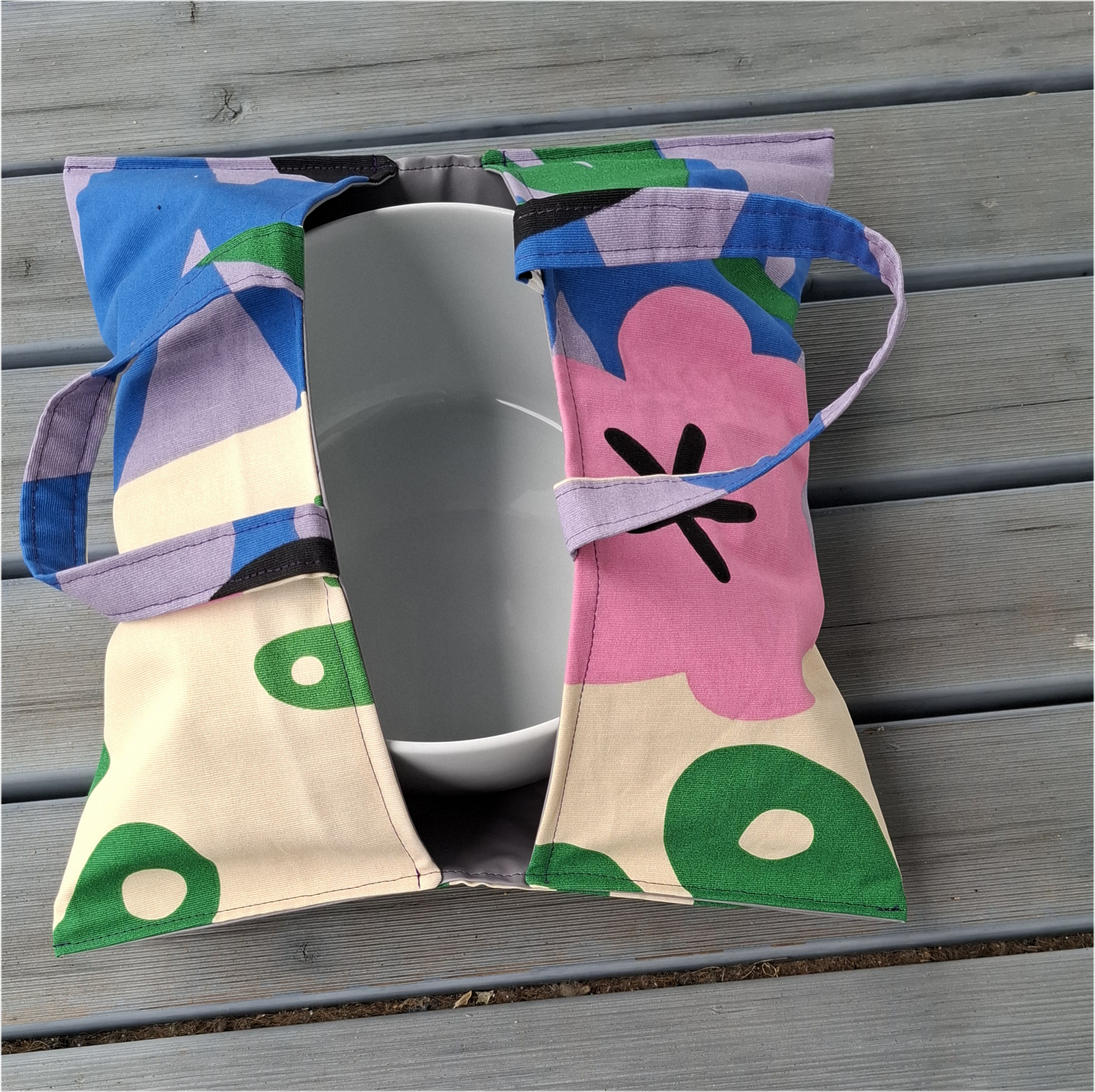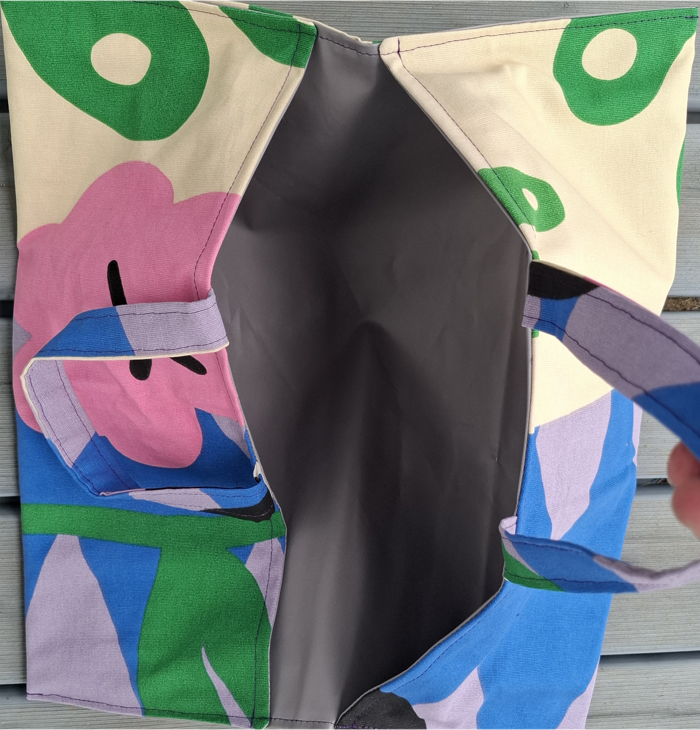 Außen wurde ein Baumwollstoff verwendet und innen – damit man/frau das Teil auch gut reinigen kann -habe ich Wachstuchstoff vernäht.