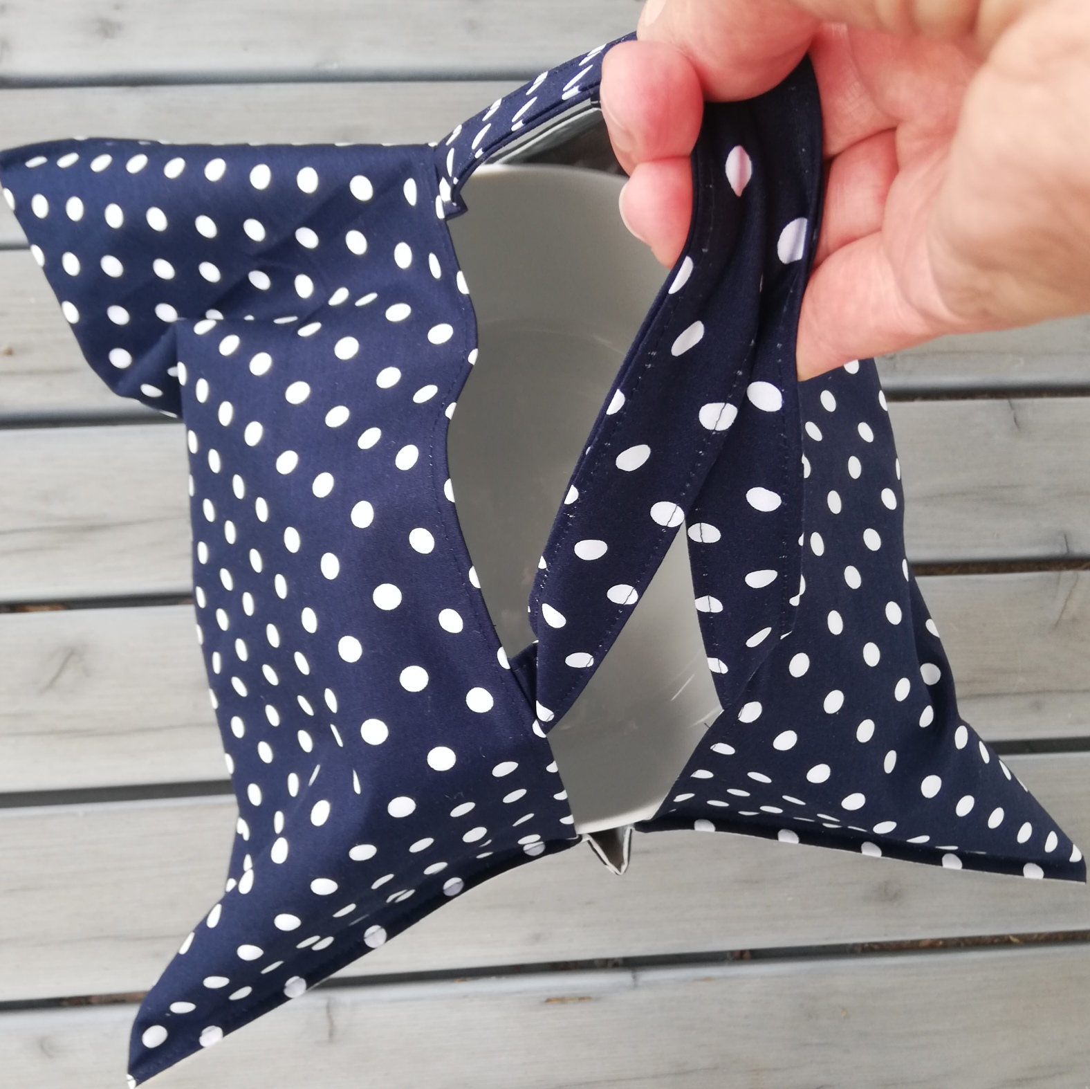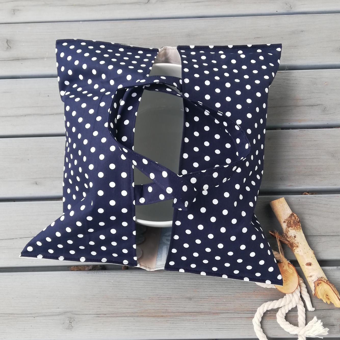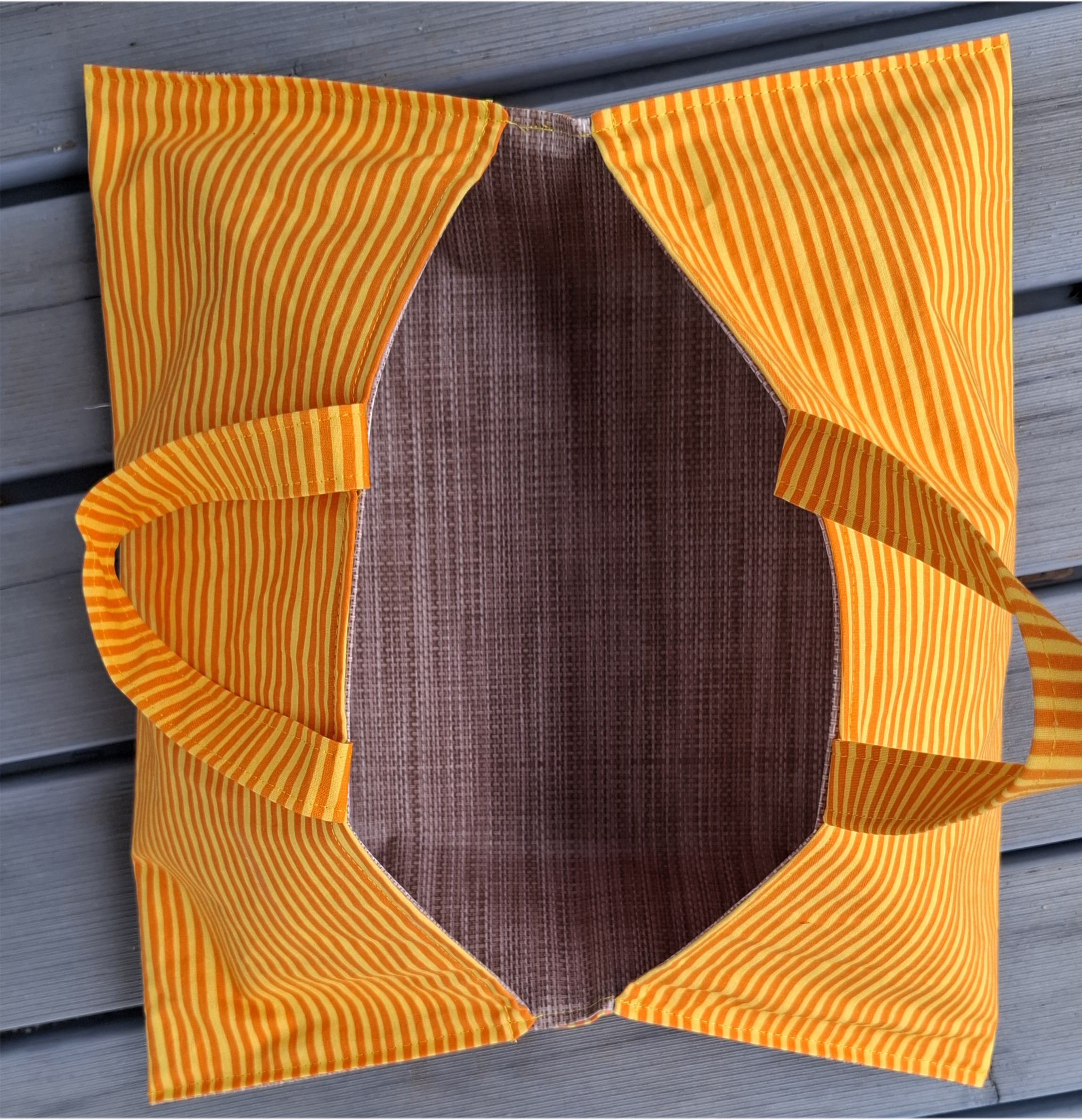Außen wurde ein Baumwollstoff verwendet und innen – damit man/frau das Teil auch gut reinigen kann -habe ich Wachstuchstoff vernäht.