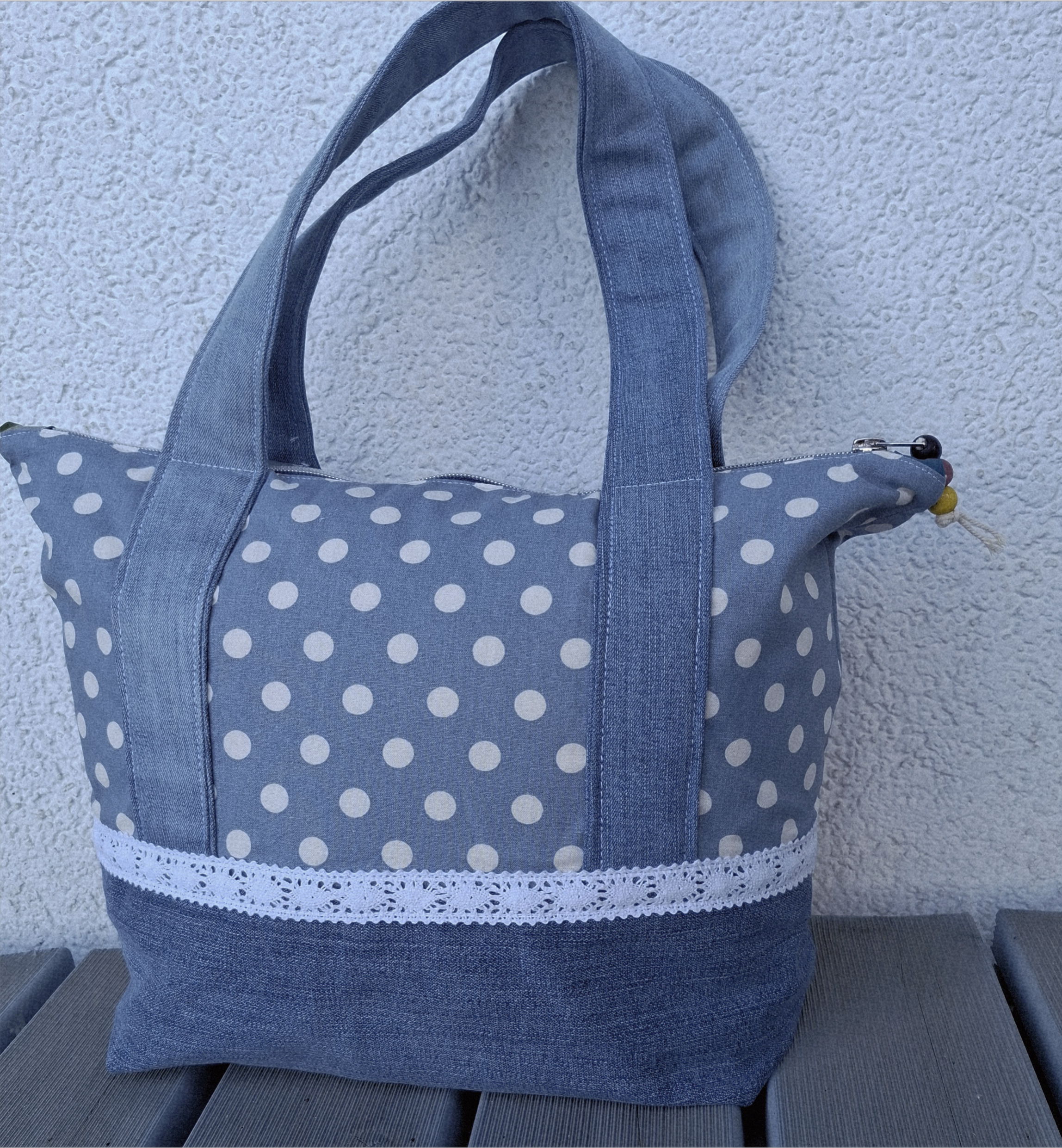 Die Henkel sind aus Baumwollstoff mit Vlies unterlegt genäht.