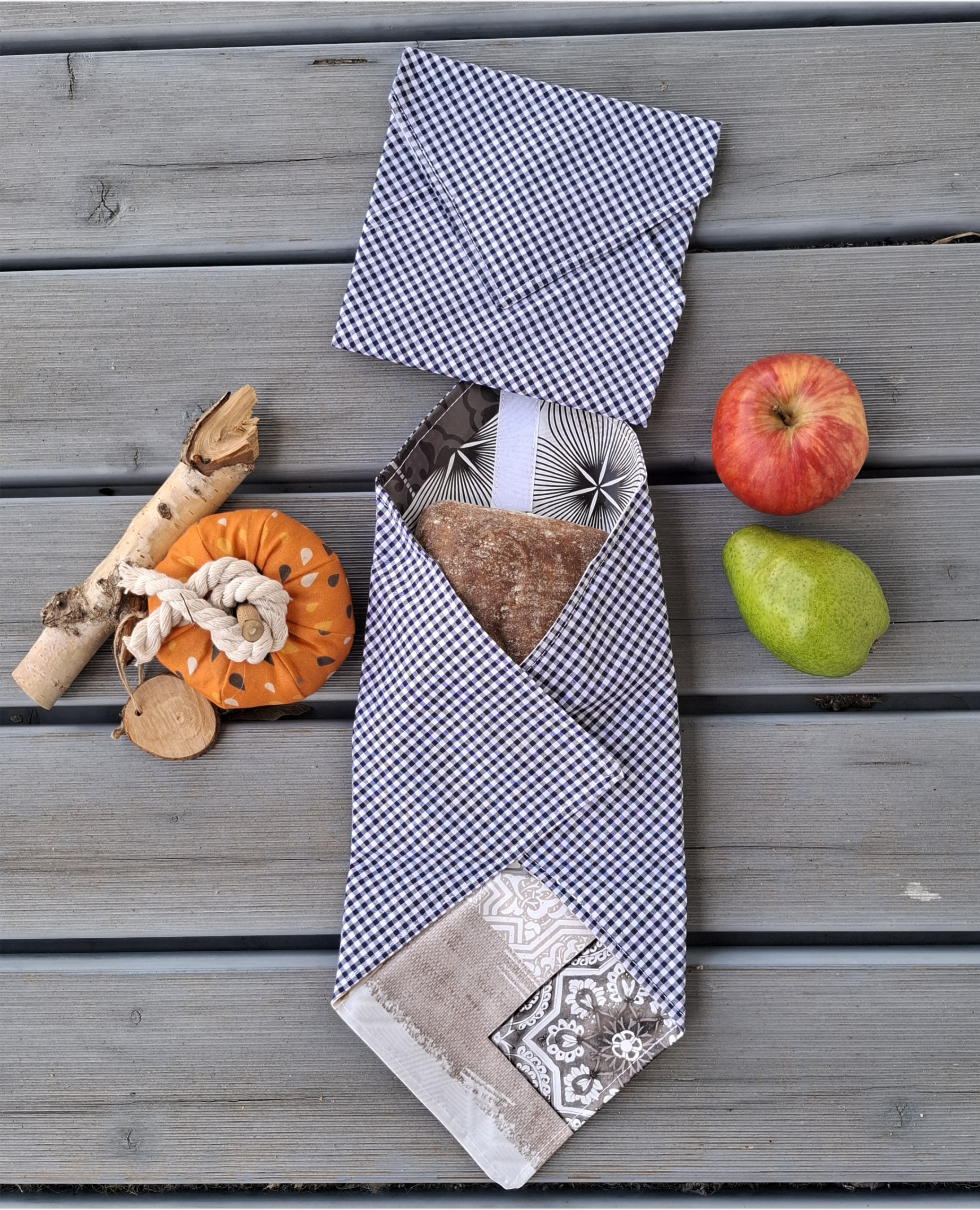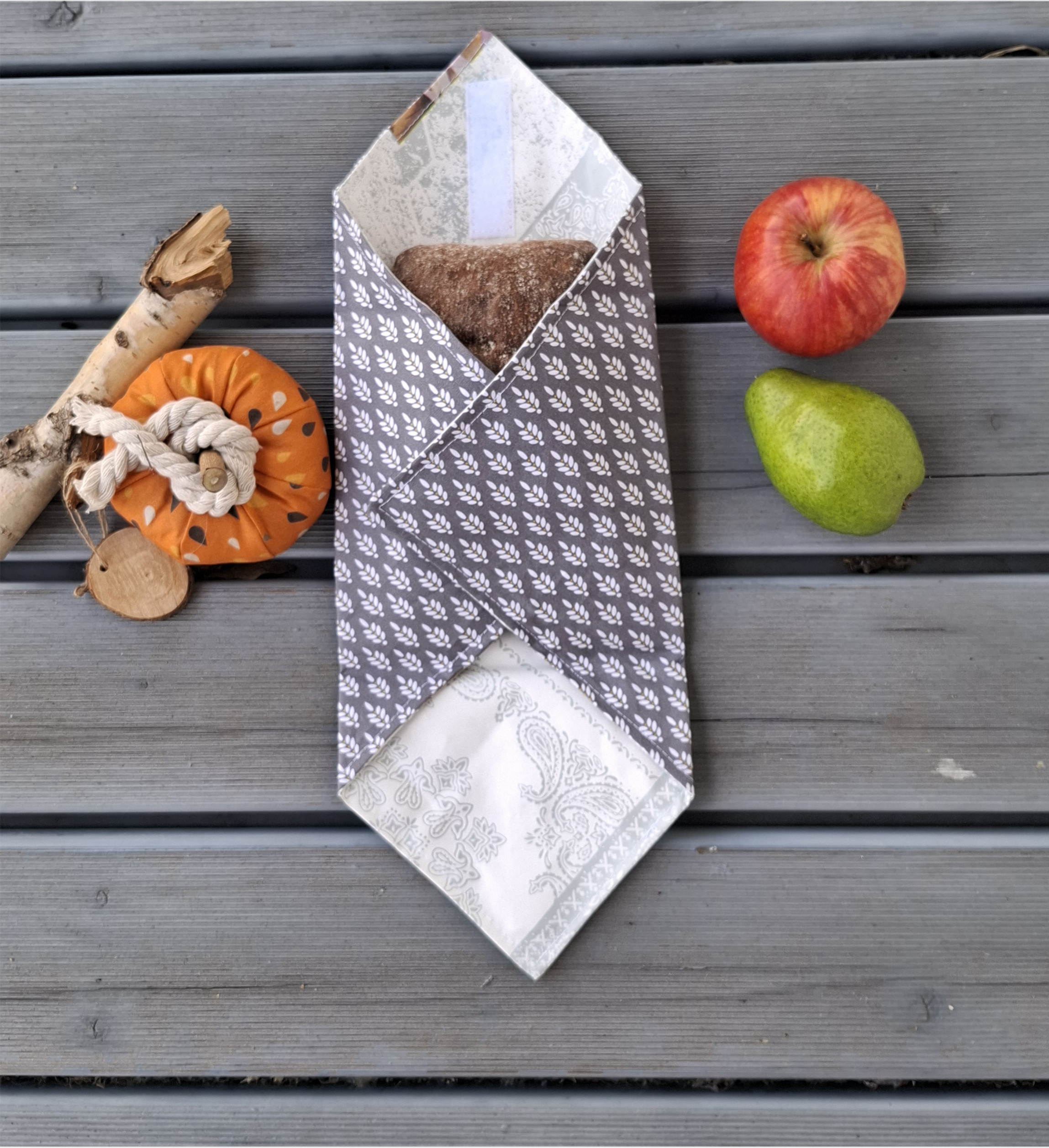 Die Hülle besteht außen aus einem Baumwollstoff, im Inneren aus einem beschichteten Baumwollstoff bzw. Wachstuch und lässt sich mit Hilfe des Klettverschlusses individuell verschließen. So kann das Sandwich oder Pausenbrot umweltschonend transportiert werden. Die Hülle kann nach dem Verzehr des Sandwiches problemlos durch einfaches feuchtes Abwischen gereinigt werden.