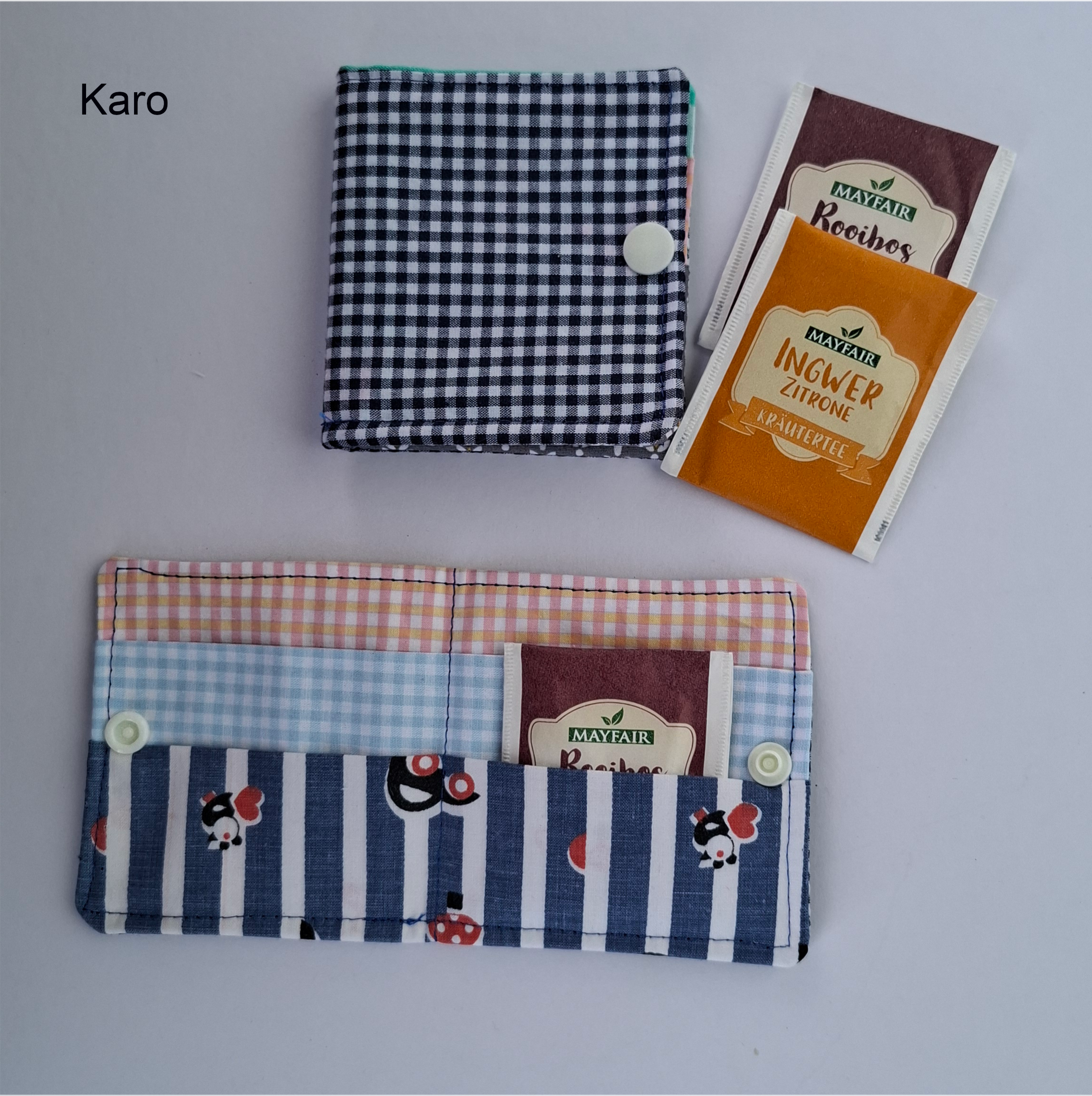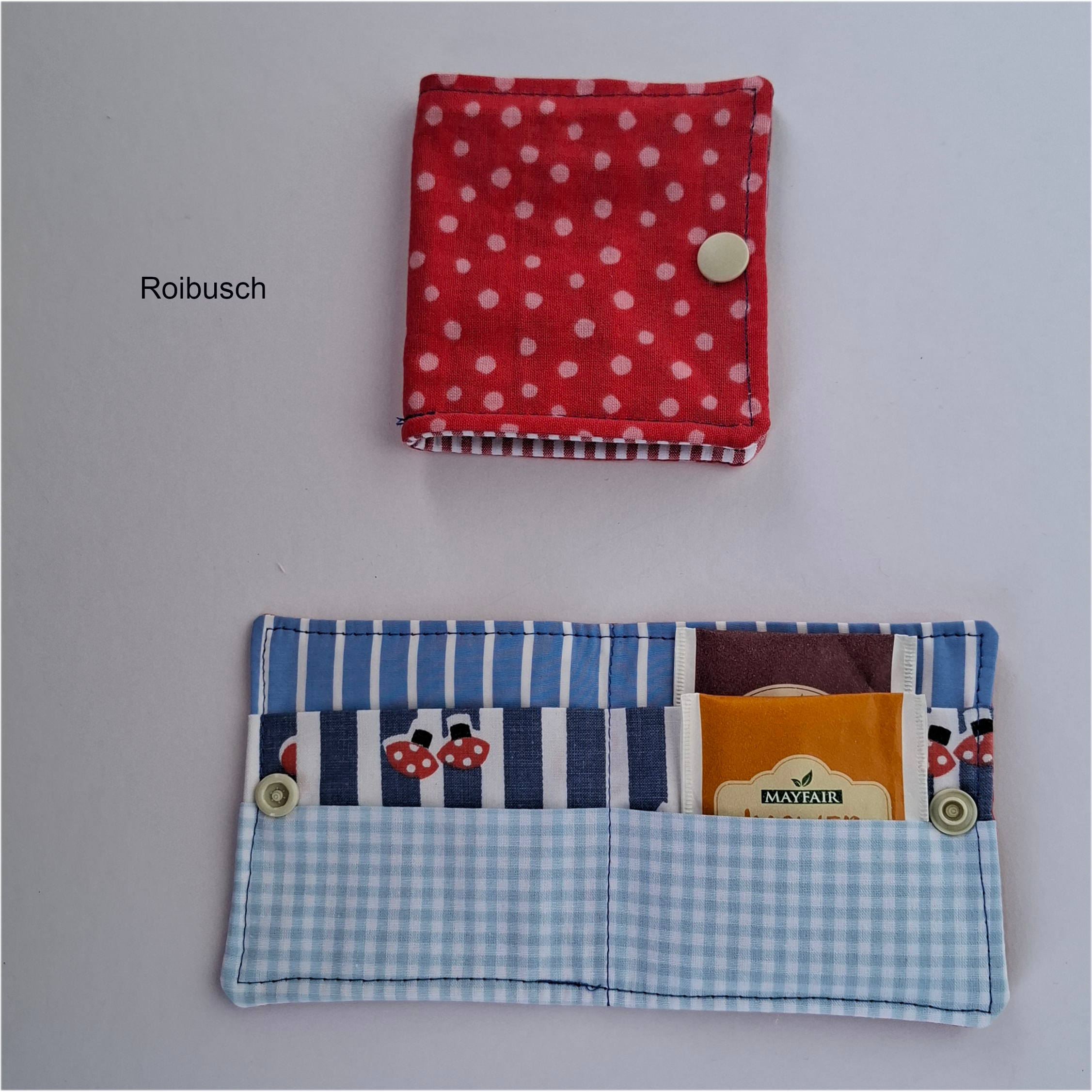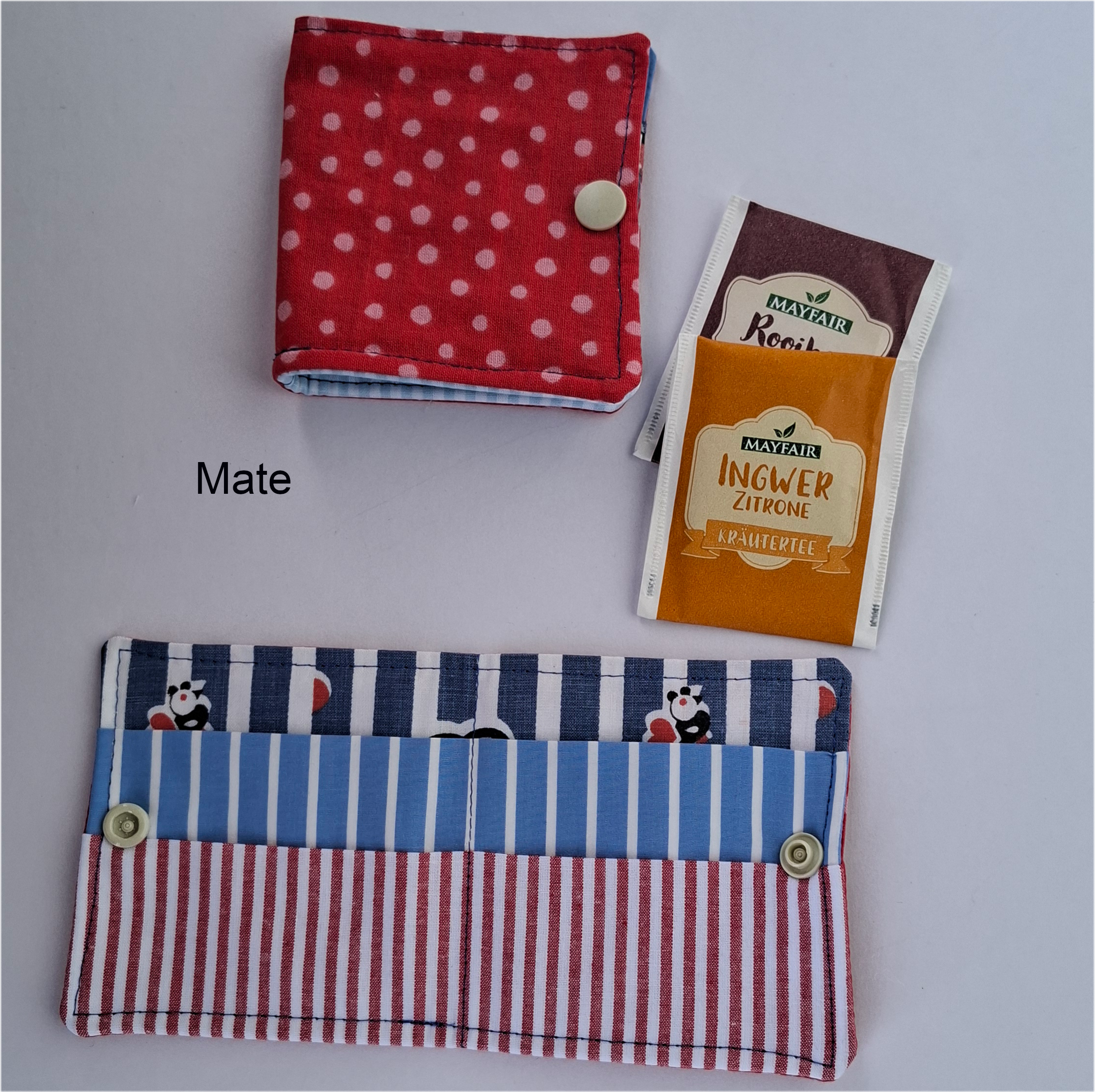 In dem praktischen Täschchen finden mindestens vier Teebeutel Platz, es kann platzsparend zusammengeklappt und mit dem Druckknopf sicher verschlossen werden. Passt in jede Handtasche!