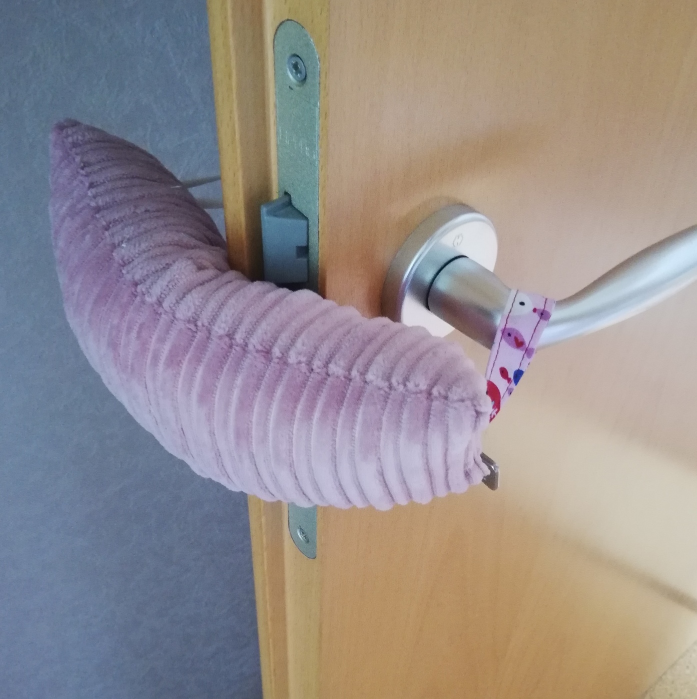 Wenn der Türstopper mal nicht gerade nicht benötigt wird, kann er an einer der Klinken dekorativ hängen bleiben.
