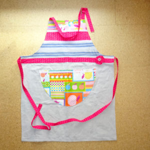 Die Topflappen sind aus einem Baumwollstoff genäht, gesteppt und teilweise mit Schrägband eingefasst.